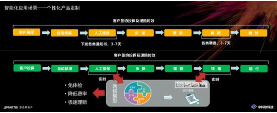 在这张图的上半部分是模型实施之前的客户承保及理赔流程,对于医疗保障类产品当达到一定保额后,按照传统规则是要求客户进行体检的,体检过后还需要经过人工核保才能判断客户是否可以投保,同时在理赔阶段,保险公司也需要经过一定的调查才能进行理赔。这种传统的流程时效性差,且客户体验不佳。那么当我们有了智能两核模型以后,我们可以通过模型在一定程度上取代人工核保及核赔环节,以模型的计算结果为准,同时依据模型的计算结果我们可以提供进一步的优质服务,如免体检、费率的再次降低、享受一定赔付金额的实时赔付等。这是个性化定制产品应用的一个简单介绍。