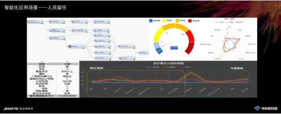 人员留任预警这个应用,场景化不是很强,所以我这里就列出了我们一些成果物。第一幅图是我们的模型设计原理,依据多种数学模型的组合判断给出人员离职登记。第二幅图是,模型计算完毕后对评测人概况的一个展现,大家可以看到评测人概貌有三道线,其中两道虚线是安全线、预警线,实现是评测人的实际表现。人力资源人员可以根据这个概貌来进行判断。