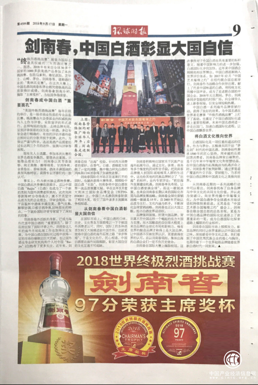 剑南春获国际大奖一方面向世界展示了中国三大名酒深厚的底蕴和优秀的品质,另一方面则彰显了国富民强,中国文化越来越被全球世界所认可的现实。《环球时报》用整整一个版面深度报道此次事件,西方重量级媒体《华尔街日报》也以头版头条的重要位置刊登本次获奖事件。