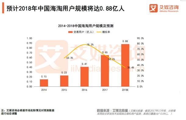 iiMedia Research(艾媒咨询)数据显示,截止2017年底,中国跨境电商整体交易规模(含零售及B2B)达7.6万亿元人民币,海淘用户规模已达0.65亿人,预计2018年跨境电商交易规模将增至9.0万亿元人民币,海淘用户规模将达0.88亿人。