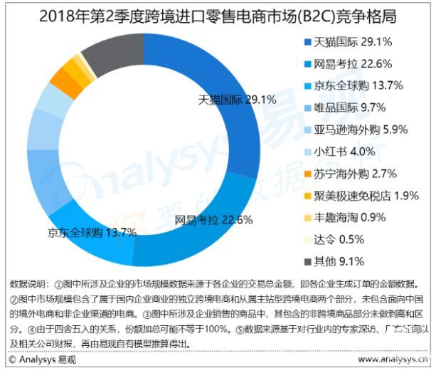 从市场表现来看,天猫国际无疑是跨境电商平台的佼佼者。2017年,天猫国际以58.2%的知名度位列各跨境电商平台之首;2018年第二季度,天猫国际以29.1%份额保持市场规模第一,同时在跨境新零售模式创新值得关注。