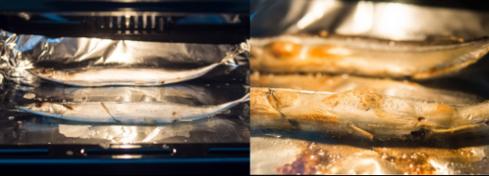 小编继续用烤秋刀鱼来验证了刚才的实验结论。烘烤之前,为了让秋刀鱼皮保持酥脆,并且达到皮肉分离的效果,小编用白醋和盐对秋刀鱼进行腌制,进烤箱前再用青柠檬皮在秋刀鱼表面涂抹了一层。将秋刀鱼放进烤箱后,选择220℃ 7分钟一翻面的高温快烤模式。时间到,打开箱门看到轻微上色焦脆的秋刀鱼,香气四溢,小编突然觉得自己也是块当大厨的料。