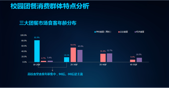 大家知道,团餐的经营业态有数十种,学校、企业和机关食堂是百强企业重点服务的三大领域,占百强企业团餐市场的85.4%。学校食堂的消费群体和其他两种场景相比,最明显的特征就是消费者年龄集中,82%的消费者年龄集中在18~24岁,高校主要是90后、00后,中小学则是00后居多。