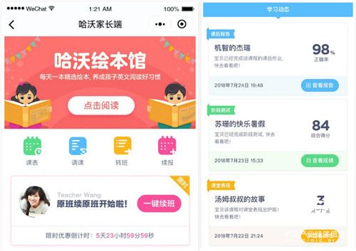 一直以来,哈沃都将孩子学情的家长反馈作为评估教学效果的重要环节,为此,哈沃在今年9月正式推出了行业首个家长端小程序。该产品以“一切为了家长(All for Parents)”为核心理念,打造了一款集所有家长需求于一体的轻量级高频使用小助手,提供“个性化学情反馈、专属服务、有资有料”三大功能。它作为学生、老师与家长间的桥梁,提供课程课表随时看、课堂表现、课程回放、课后报告等功能,为家长提供一体化督学解决方案。