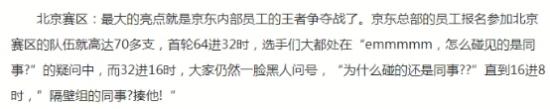 记者在查阅苏宁“狮王电竞邀请赛”和“京东杯”比赛的相关新闻资料中,意外发现了京东发布的一则有意思的新闻,在一篇《京东杯王者荣耀城市场景赛128强榜单出炉》的软文中,有这么一段话:“北京赛区最大的亮点就是京东内部员工的王者争夺战….首轮64进32时,选手们都表示‘怎么碰到的都是同事’,而32进16时,大家仍然一脸黑人问号,‘为什么碰到的还是同事’…….”
