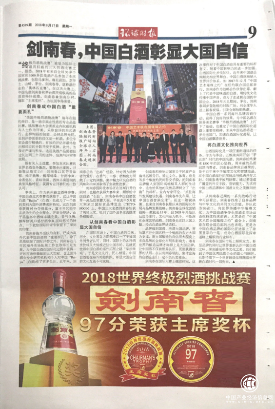 剑南春获国际大奖一方面向世界展示了中国三大名酒深厚的底蕴和优秀的品质,另一方面则彰显了国富民强,中国文化越来越被全球世界所认可的现实。环球时报用整整一个版面深度报道此次事件,西方重量级媒体《华尔街日报》也以头版头条的重要位置刊登本次获奖事件。