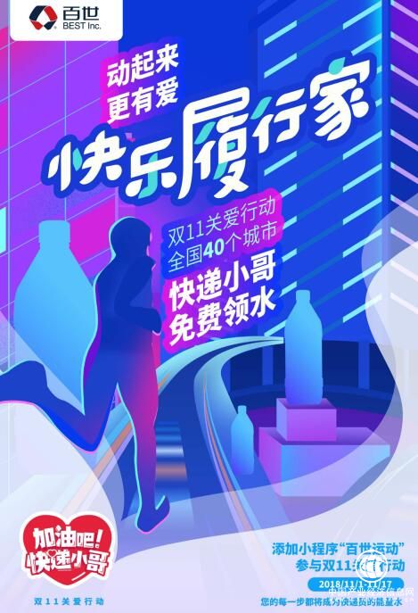 除此之外,2018年双11,百世将联合浙江传媒学院,面向全校师生,发起“快乐履行家”为快递员捐水的关爱行动。