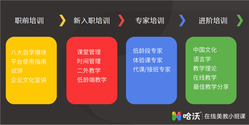 在美教入职之后,哈沃还会设置一系列、总长达1380分钟的职后培训,包括专项的授课和能力拓展培训。所有的美教老师在经历些培训之后,就会成为符合哈沃要求的优秀外教。