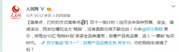 前几天,人民网发了一条微博,里面点名了苏宁易购今年补贴的主要的玩法——10亿更好用的购物补贴。