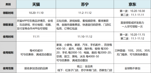 天猫时间为双十一当天,苏宁则是10号~12号。私以为10号使用购物补贴的概率并不是很大,大多数消费者的重心还是放在了11号当天,但是12号的返场可使用也是不错的力度。