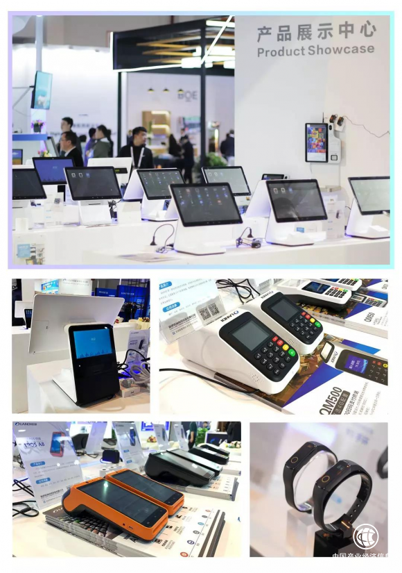 在联迪商用产品展示区,可以看到市场应用超400万台的APOS系列智能POS终端、重新定义新标准的AECR系列智能收银终端、丰富场景应用形态的QM系列扫码支付终端、大气有内涵的ACM系列智能自助终端。