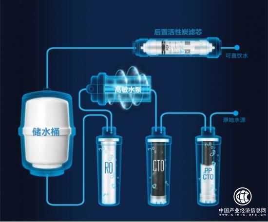 随后流经高敏水泵,接受第三关的“考验”——反渗透RO膜,对水中重金属进行深度滤除,过滤精度为0.0001微米,使净水脱盐率达到96%;三关过后,自来水进入储水桶,用户使用时,自来水还需经过最后一关的“考验”——PCF后置活性炭,目的是让水质更纯净,口感更佳。