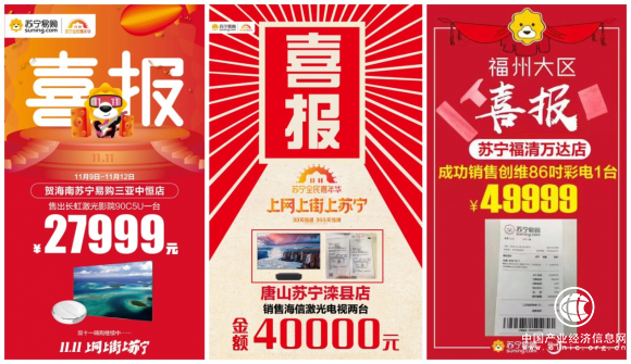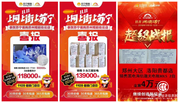 苏宁将万元大屏卖成了市场爆款,这与苏宁在线下的渠道布局是密不可分的。自国庆以来,苏宁就带着一大波网红电视,在线下开启高端巨屏品鉴会,引发消费者广泛关注。加之一系列的促销玩法,引得土豪们纷纷下手,甚至开启全家换电视的模式。苏州观前街店某位土豪一举拿下3台索尼OLED电视77A1,总价118000元;而另一位土豪则承包了9台三星大屏彩电,总价139000元。洛阳贵都店某位土豪,则为家里换购了两台80英寸海信激光电视,总价40000元。