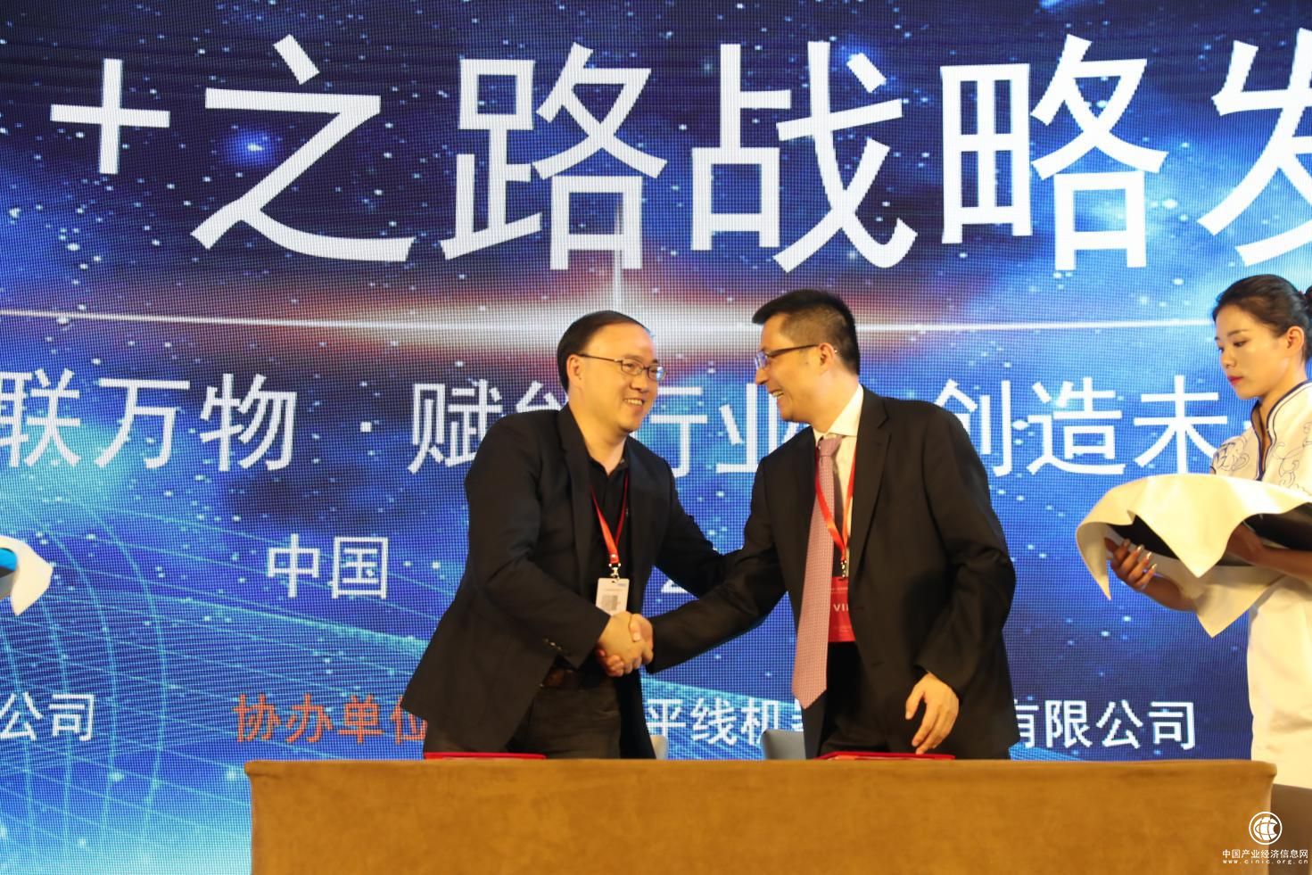 润和软件董事长周红卫(右)与地平线创始人兼CEO余凯在签约台前握手