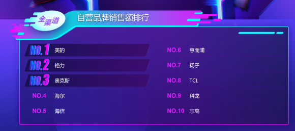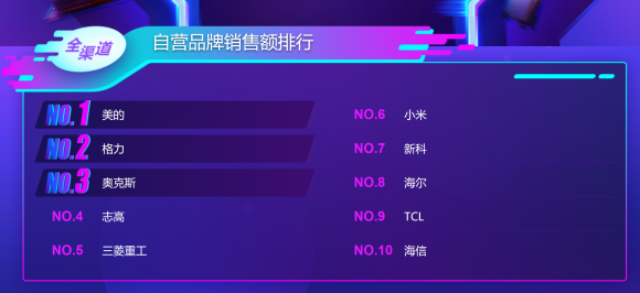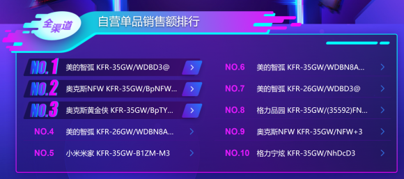 从单品销售额排行也可以看出,美的更加后力十足:第一和第二的单品均为美的空调,前十中有6款美的产品入围,作为对比,奥克斯拥有2款,格力拥有2款,这两个品牌想要反杀美的确实有些难度。