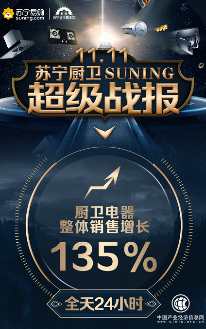苏宁数据显示,11月11日13分钟厨卫电器销量已经突破10000台。截至当日24点,苏宁厨卫电器整体销售增长高达135%,蒸烤箱同比增长高达187%。新兴品类净水器与洗碗机分别增长178%与158%。