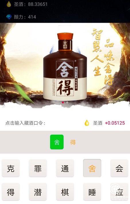 接下来,用户在酒链世界“看广告”的过程,是用户参与玩一个与广告主品牌相关的拼字游戏。比如“舍得”酒的广告,需要用户在一堆乱序文字中,准确点选出“舍得”两个字,才算完成。