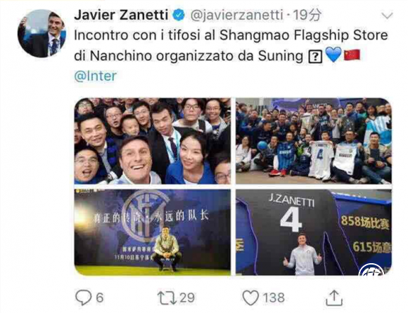 作为此次特邀嘉宾,萨内蒂前来南京不仅为苏宁双十一全民嘉年华打Call,也是为球迷们“夺回双十一”加油助阵。活动气氛热烈,萨内蒂先生本人也将有趣的合影上传社交媒体,与全世界的内拉分享他在中国的足迹。