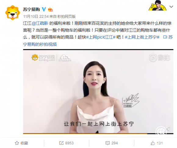 作为娱乐圈中少有的高学历、气质优雅的女艺人代表,江疏影在服装穿搭、护肤美妆上都有自己独特的见解。双十一购物嘉年华之际当然少不了购物,江江通过一段视频提醒大家不要错过苏宁全民嘉年华的优惠活动,抓紧上网上街上苏宁。有趣的是,视频中江江的购物车一晃而过,竟然成了粉丝和网友们争相猜测的对象。江疏影双十一在苏宁都买了什么?苏宁易购借势和网友粉丝玩起了“猜谜”,给大家准备了一整个购物车的福利,只要在评论中猜对江江的购物车都有些什么,就可以获得所有的商品!