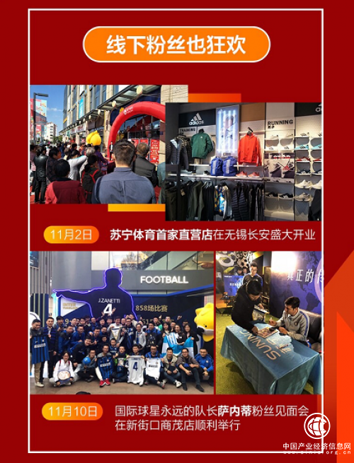 本次双十一全民嘉年华,苏宁易购提出了“上网上街上苏宁”的口号,不仅自营运费全免,而且还推出了10000店参与、为500万任性付用户提额100亿、10亿购物补贴、30天价保等一系列重磅举措。在本次双十一,苏宁体育零售首家直营店在无锡长安盛大开业,同时,在双十一爆发前一天,世界传奇球星萨内蒂还亲临南京苏宁体育商贸店和粉丝近距离接触。