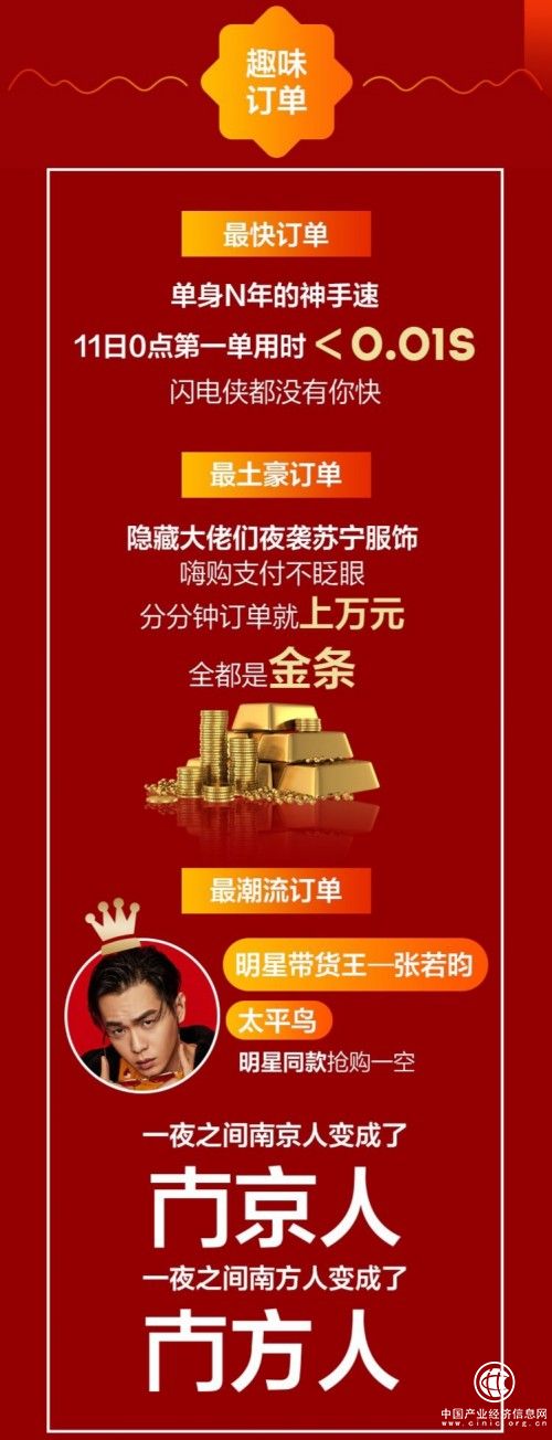 在很多人心中,双十一是最热闹的“剁手节”,通宵达旦“买买买”,这晚除了拼人品,还要拼手速。仿佛稍有不留神,自己心仪很久的宝贝就要被抢走。据苏宁服饰大数据显示,11日零点第一单用时不到0.01秒,成苏宁服饰最快订单;除此之外,明星同款服饰抢购一空,张若昀荣获当天明星带货王。