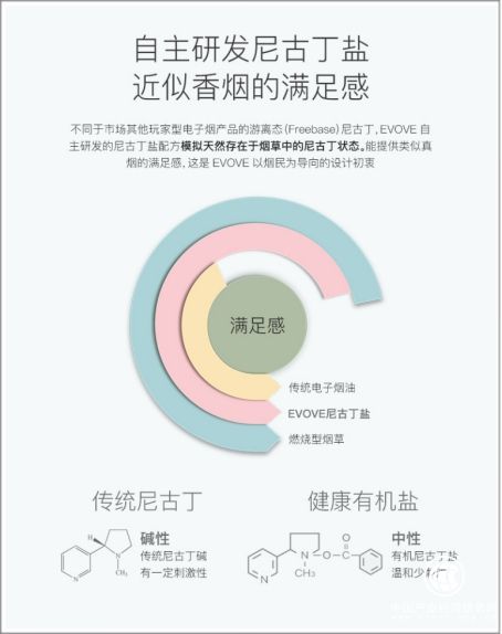 据EVOVE团队介绍,电子烟的本质是在不带来传统烟草其他有害物质的同时满足烟民身体对尼古丁的需求。过去10年,电子烟在欧洲和美国深刻改变了烟草行业,开始与传统烟草在寸土寸金的便利店货架展开竞争。2014年,电子烟在中国市场开始回暖。与欧美不同的是,电子烟在中国市场的过去几年更多的是作为一个小众潮流产品局限在玩家市场。这些产品使用繁杂,尼古丁传输效率极低,尝试过的烟民普遍抱怨电子烟难以替代香烟,“不过瘾”。EVOVE团队采用了自主研发的尼古丁盐技术,为的就是给烟民提供和传统香烟类似的满足感。不同于普通电子烟的游离态尼古丁,EVOVE的尼古丁盐技术能模拟香烟天然下的尼古丁状态,是真正可以替烟解瘾的黑科技。据EVOVE团队介绍,在不带来传统烟草其他危害的同时如何高效满足烟民群体对尼古丁的需求将一直是产品团队未来聚焦的核心。