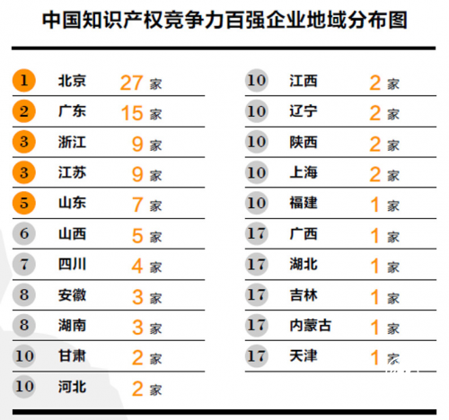 中国知识产权竞争力百强企业分布于我国21个省级行政地区。其中,北京27 家、广东15家、浙江9家、江苏9家以及山东7家,这五个地区的知识产权竞争力百强企业合计占据了百强企业的三分之二,达66家。在中国知识产权广州指数排名中,这五个地区排名前五;在GDP 排名中,这五个地区中的其中四个省排名前四。由此可见,企业知识产权竞争力与所在地的经济发展息息相关、相辅相成,良好的经济环境吸引和造就了更多百强企业,百强企业也反哺地区经济发展。