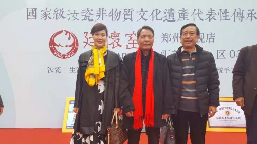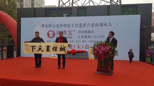 李廷怀大师43年来执着追寻汝瓷梦,从一个普通工人做起,逐步成长为一个享受国务院特殊津贴的国家级大师。“昔日王谢堂前燕 飞入寻常百姓家”李廷怀秉持“为民造瓷,健康中国”大理念,坚持传承、创新和发展大格局,研制出天青、卵青、月白、玉青、活态瓷11大类500多个品种,拥有48项外观设计专利,5项实用新型专利,2项发明专利。特别是新近研制的活态瓷,茶具、酒具、餐具等使用后,让人们在欣赏艺术的同时,享受养生健康之乐。近几年来,在创新造瓷的同时,他还注意与国际友人的交往,先后十余次应邀参加国际研讨会,向外推介汝瓷、宣传汝瓷,让汝瓷走出国门,风靡全球。资深媒体人陈明武感怀于李廷怀大师执著汝瓷的情怀,开业现场即兴诗赞:《汝瓷之美·致敬大师》——写在廷怀窑郑州旗舰店开业之际。“你是宋朝皇族的萌宠/你是修炼千年的精灵/你是大自然恩赐予人类的瑰宝/你是中华民族优秀文化的结晶!一双粗砺的大手把泥胎往炉里送/两只热望的眼睛渴盼你烈火重生/满脸沧桑的皱纹被炉火烤得经纬分明/你开片的天籁之音让老工匠热泪纵横!那个老人满怀慈爱把你视若宠儿/千年汝瓷又发新芽全球为你动容/穿越历史你带着一身惊艳走出深宫/新时代“为民造瓷”你将有新的使命!”