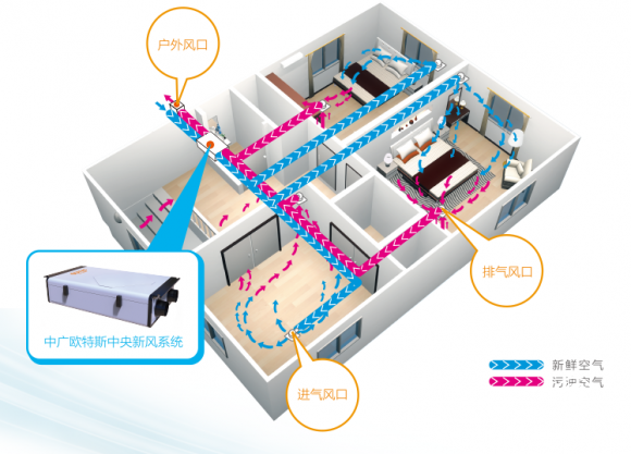 4、全屋净化,自由深呼吸:中广欧特斯中央新风系统能快速净化全屋,将PM2.5接近为0,令氧量高的新鲜空气通过全屋净化系统源源不断输入室内,各个房间同步实现高效净化。