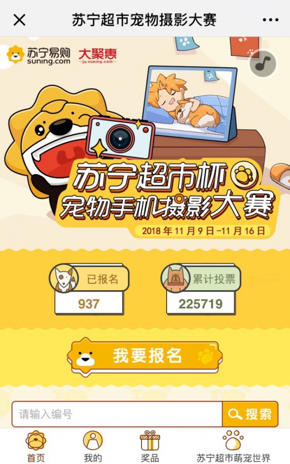 此次“苏宁超市杯” 宠物手机摄影大赛,由苏宁易购发起,联合中宠,顽皮,皇家,小佩,雪貂留香,克劳德医生,疯狂的小狗等知名宠物品牌举办。主题围绕宠物日常工作、生活场景,抓拍“真”“善”“美”,定格“我与萌宠”的画面,传递关爱动物、人宠和谐的生活导向。通过线上招募(开启报名通道+拉票通道)的方式,投票评选出前20名,为萌宠赠送精美礼品。