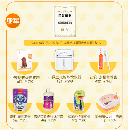 亚军奖品同样丰富,宠物的生活一定会更舒服,苏宁超市准备的礼品真可谓体贴周到。