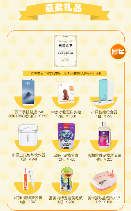 冠军奖品堪称豪华,与近段时间火热的锦鲤礼包难分伯仲。冠军奖品不仅有魅族16手机一部,还有12包中宠动物蛋白狗粮、小佩智能投食器、小佩二代饮水器等。从准备的奖品可以看出,主办发苏宁不仅为萌宠准备了好吃的狗粮、舒适的小家、干净便捷的饮食设备,还准备了一部专门记录主人和萌宠间相处时光的手机,可谓诚意满满。
