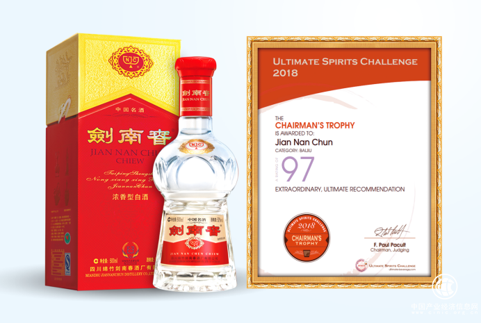 “终极烈酒挑战赛”被誉为国际上最具权威的三大烈酒比赛之一,据悉,2018 年有来自全球 30 多个国家的 1000 多款美酒产品参加了本次挑战赛,包括法国代表马爹利、美国代表百加得、英国代表芝华士、日本代表山崎、中国代表茅台、剑南春等,堪称酒行业的“奥林匹克赛”。在这次大赛上,中国名酒剑南春和茅台都凭借极高的品质分获第一、二名。剑南春拿到高分97分,摘取全场最高奖项“主席奖杯”,为祖国争得荣誉。