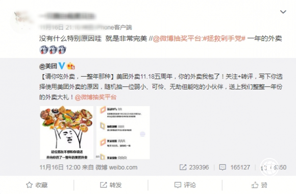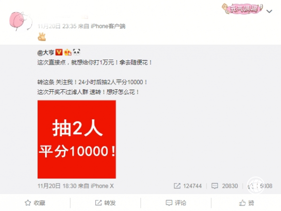 双十一期间,微博上出来了许多大奖。前有王思聪抽出的113人,每人1万元的现金大奖。后有苏宁抽出的11份“转运大狮”与1位“全民星大狮”,共计12份价值超过30万的大礼包。