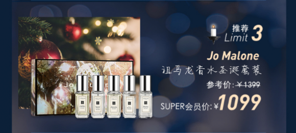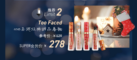 寒冬已至,圣诞节也不远了。每一年许多品牌都会推出圣诞限定套装、圣诞限定配色。在黑色星期五,这些专属限定可以在23日、24日预约,super会员25号0点可以提前开抢,普通会员到25号23点59分59秒开抢。各大品牌的圣诞限量礼盒系列,如Too Faced 2018圣诞树限量彩妆套装组、Jo Malone香水圣诞套装、NARS 2018圣诞限量三色颊彩盘、GUCCI Queen Margaret手拿包,消费者可提前感受节日氛围,让身边好物提前装点上圣诞气氛。