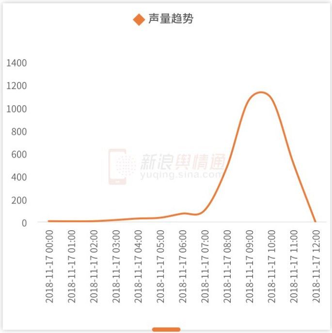 从首条信息在网上出现,截至东方航空在微博发布公告,即11月17日1时50分至11时54分,全网信息高峰出现在当天9时、10时。如此来看,该事件首条相关信息在网络上出现到官方回应,总共历时8小时左右。从突发事件的处置时效上来看,东方航空回应速度较快。