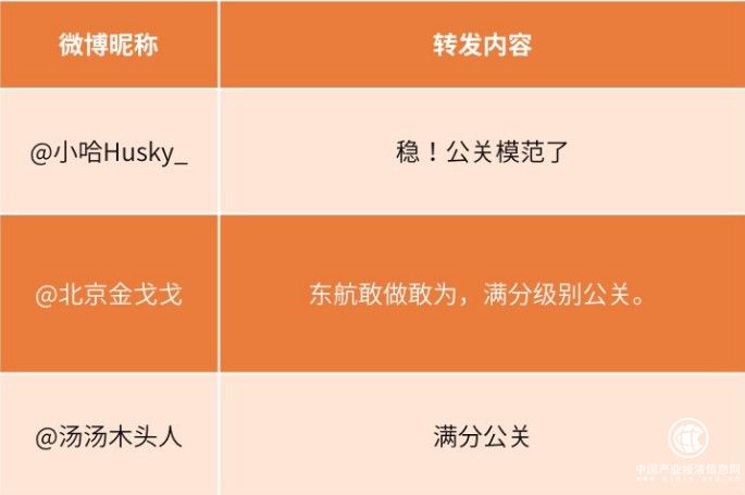 同时,提及热词的转发内容TOP3分别为“稳!公关模范了”“东航敢作敢为,满分级别公关”“满分公关”。