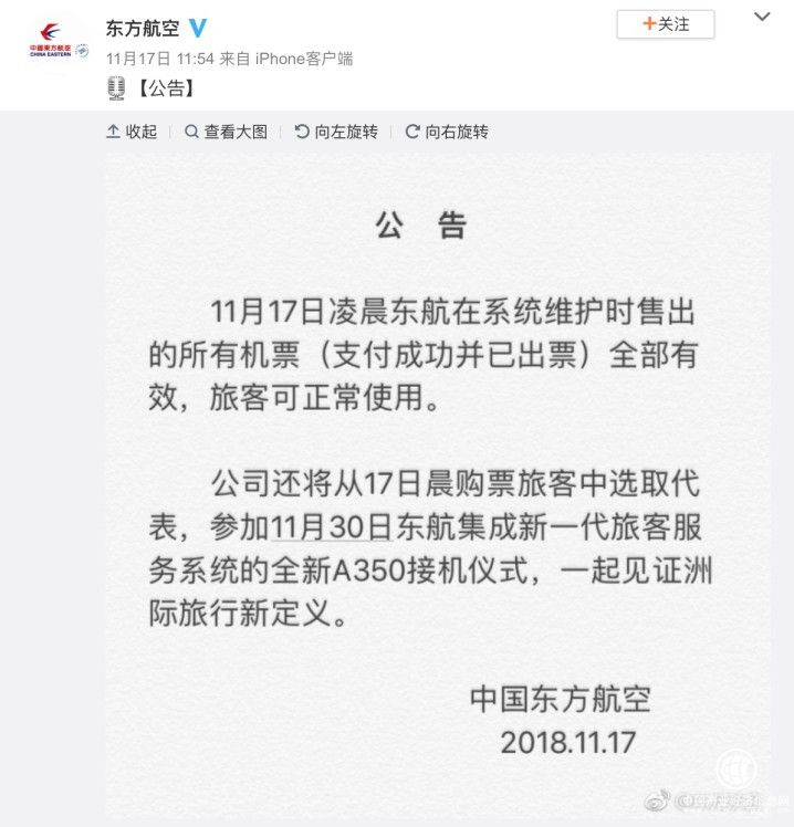 2018年11月17日凌晨,东航系统被爆出现Bug,很多航线的机票折扣极大,部分机票价格仅为50元,多条国内航线头等舱商务舱往返机票,最低只需90元!一时间,东航bug成了微博热搜。面对这一突发性事件,东方航空的应对措施,被众网友点赞,人民日报微博也发文“东航这波被网友称为教科书式的公关究竟怎么回事”。那么,这场被称为教科书式的公关,是如何演绎的呢?