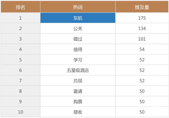 通过新浪舆情通对于该条微博的微博传播分析可知,这条被转发6000余次的微博,在传播过程中的前10大热词依次是“东航”“公关”“错过”“值得”“学习”“五星级酒店”“兑现”“邀请”“购票”“接收”。