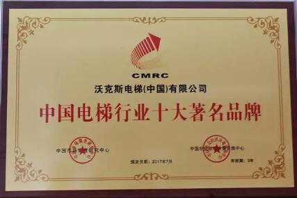 2017年7月,中国市场调查研究中心联合中国社会经济决策咨询中心等多家权威机构以及评审委员会组织专家对申报企业进行综合评价和确认。沃克斯电梯顺利通过复审,再次被认定为“中国电梯制造业十强企业”、“中国电梯行业十大著名品牌”荣誉称号。