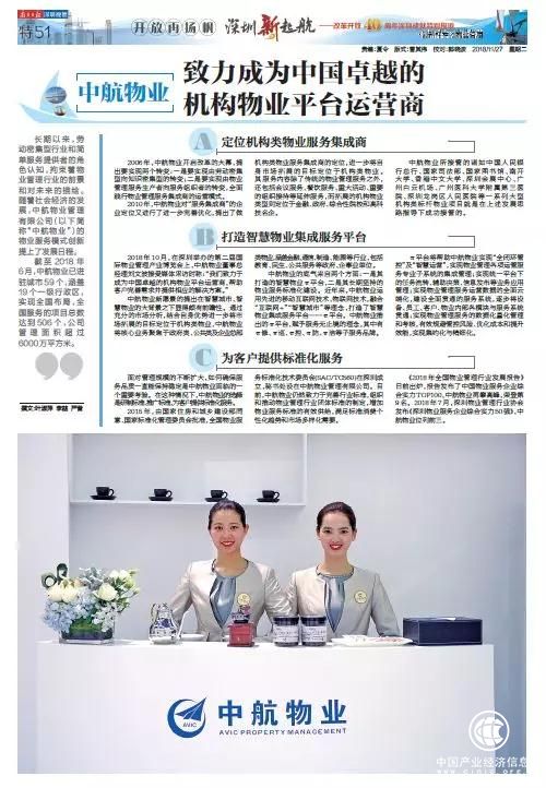 中航物业作为一家改革开放初期起源于深圳的大型物业管理企业,入选了《南方日报》改革开放40周年深圳成就特别报道的“创新样本”栏目,文章如下: