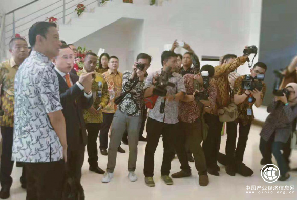 (卢敏放向印尼投资协调委员会主席Thomas Lembong介绍工厂情况,当地媒体高度关注)