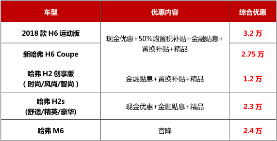 与此同时,在现售车型上,新哈弗H6 Coupe和2018款哈弗H6运动版,均可享受现金优惠、购置税减半、金融贴息等多重优惠大礼,最高综合优惠额度达到3.2万元;哈弗H2创享版和哈弗H2s的综合优惠额度则最高达到了2.3万元;哈弗M6更是直接官降2.4万元,仅售6.6万元起。