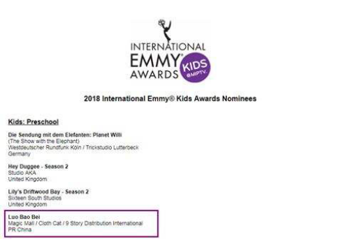 今年10月,世界顶级电视艺术大奖“国际艾美奖”宣布,中国原创学龄前动画片《洛宝贝》入围“2019年国际艾美奖儿童奖”提名名单,并成为本届提名的学龄前板块作品中唯一一部中国原创作品。消息一经宣布便引发了全民热议。有媒体报道“在这个全球顶级作品齐聚一堂的国际电视节目盛会上,能够赢得动漫发行专家、业界大咖的关注和认可,这对于一家中国民营文化企业、对于整个动漫行业、乃至整个中国文化产业而言,意义非凡。”