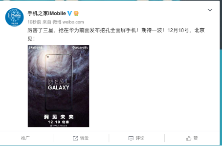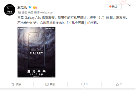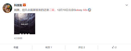 12月3日,三星官方发布Galaxy A8s预热海报,预告12月10日发布会即将在北京召开,主题为“洞见未来”。一时间仿佛一石激起千层浪,微博上各大科技媒体微博和大V纷纷转发。这不仅是因为全新的屏幕技术将应用到与我们日夜为伴的手机上,更多的还是因为在10月份Galaxy A9s新品发布会的时候,三星就已经给Galaxy A8s留下了悬念。