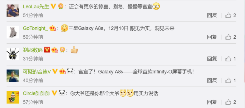 作为全面屏风潮的先驱和核心技术拥有者,在激烈的全面屏大战中,三星一直也是用户们的关注焦点。Galaxy A8s官宣海报下方,网友们的评论也亮了,对新机充满了期待。犹抱琵琶半遮面,这种全新的HID屏幕技术,使用体验会是什么样呢?还真是让人心痒难耐。