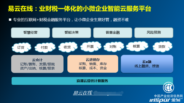 浪潮易云在线平台作为浪潮集团专为小微企业量身打造的互联网+财税金融服务平台,融合财税业务自动化处理和人工智能技术,为小微企业财务、业务和经营赋能。目前已拥有浪潮云会计、浪潮云进销存、云e融、云订货等多款SaaS产品,免安装、免维护,随时随地有网就能工作,已累计服务用户80万,积极对接各地企业上云行动,仅济南就扶持企业上云超1000家,成为企业上云行动落地的有力支撑。