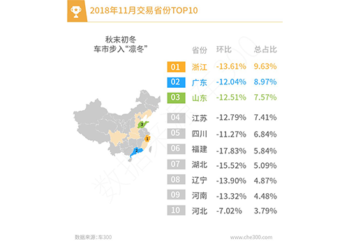 本月各省份二手车交易量TOP10榜单,前三甲与上月保持一致,分别为浙江、广东、山东。相比于上月,TOP10榜单各省份二手车交易量均呈下降趋势,平均降幅达-12.98%,可谓“一片萧瑟”。