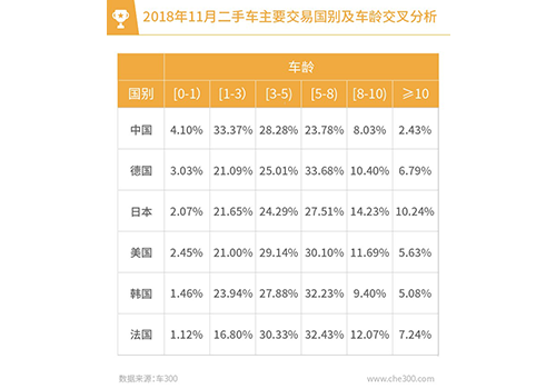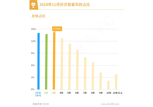 11月份各车龄段二手车交易量分布中,三年车龄的交易量占比最高,总体占比达13.94%;四年车龄的交易量降幅相对较高,为-18.45%。