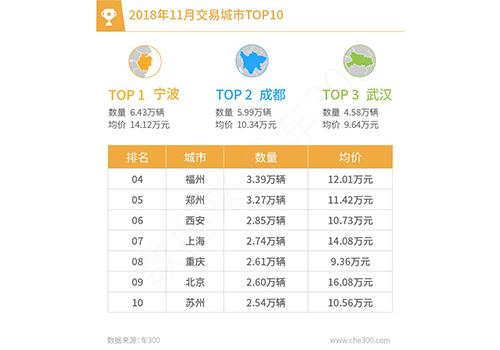 11月,不仅TOP10各省份二手车交易量呈下降趋势,TOP10各重点城市二手车交易量亦呈下降趋势,本月重点城市二手车交易量TOP10榜单,销冠仍是宁波,销量为6.43万辆,相比上月减少3.82%,成都以5.99万辆交易量,环比降幅-5.40%,位居第二,排在第三位的仍是武汉,销量4.58万辆,环比降幅-14.17%;TOP10榜单前三甲交易量均呈下跌趋势,平均每城市交易数减少约4千余辆,平均降幅达-11.17%。